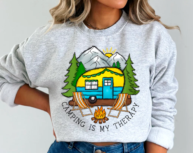 Camping is My Therapy design can be done on Bella Canvas or Gildan shirts. We can put this on t-shirts, long sleeve or crewneck in most sizes. There is a $2 upcharge for Bella Canvas.