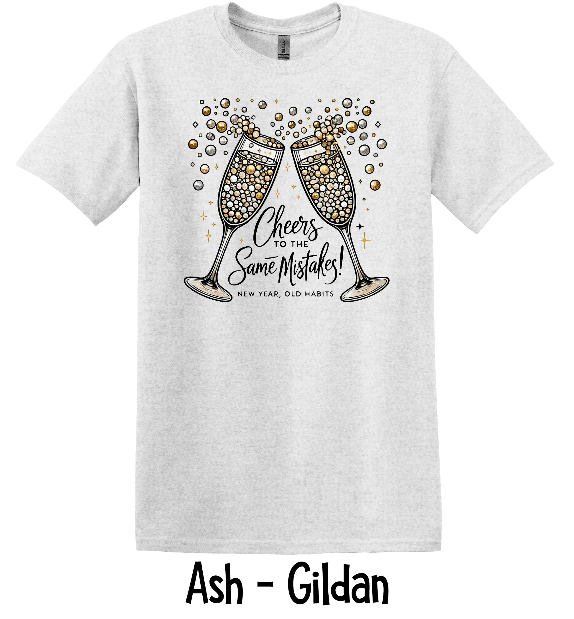Grab your Cheers to the Same Mistakes shirt in 5 different color options! T-shirts, long sleeve (except heliconia) and crewnecks are available. These are only being done on Gildan shirts due to color, style and sizes that are available.