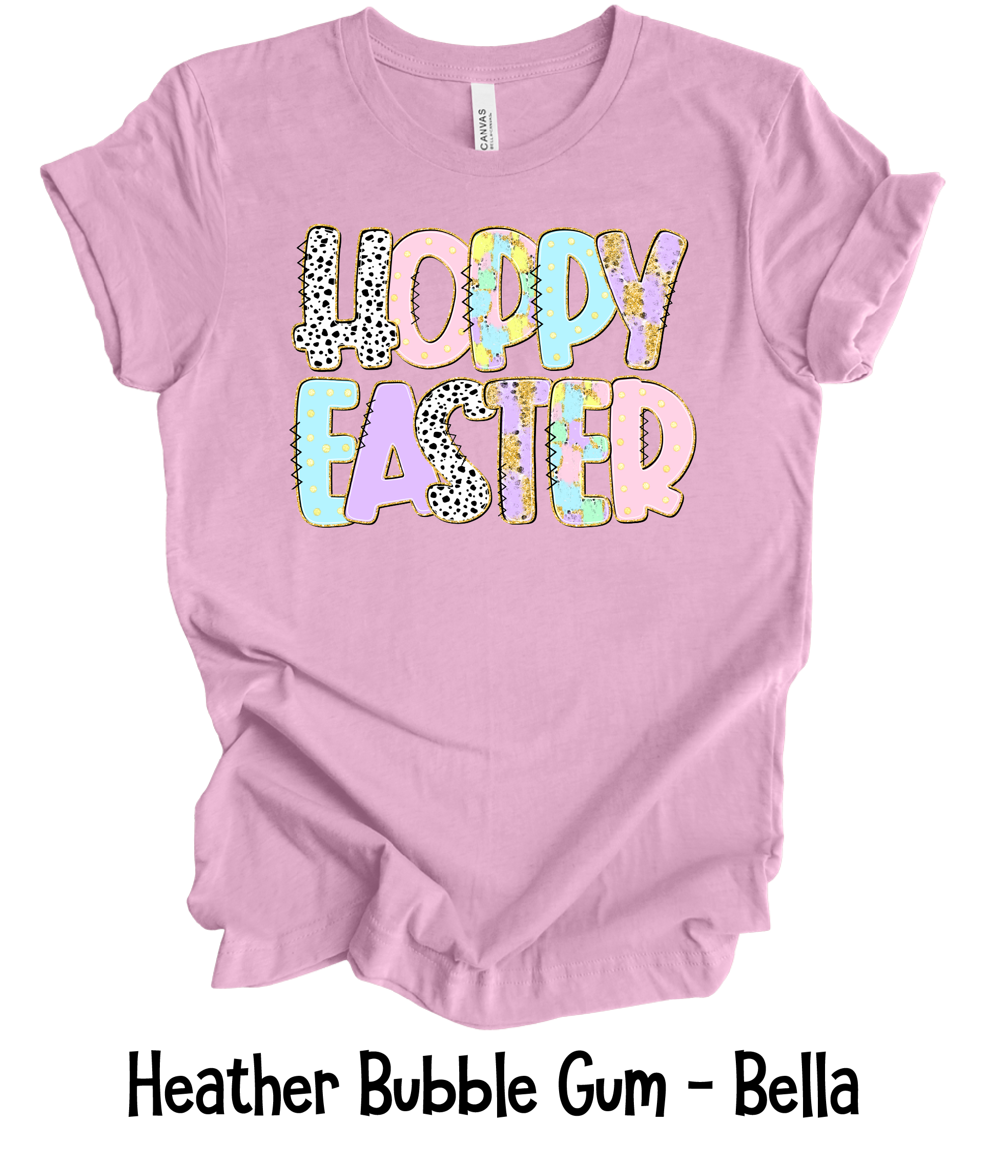 Hoppy Easter design is done on Bella Canvas unisex t-shirts.