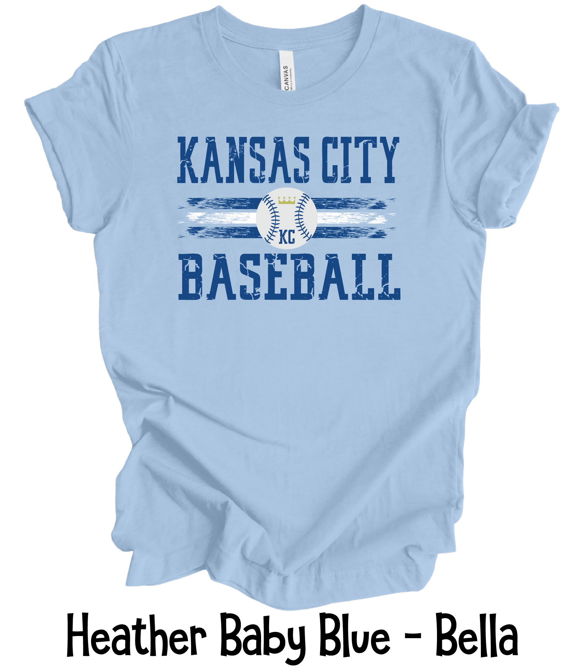 KC Baseball Distressed is offered on Bella Canvas shirts. We can do t-shirts, long sleeve and crewnecks in most colors.