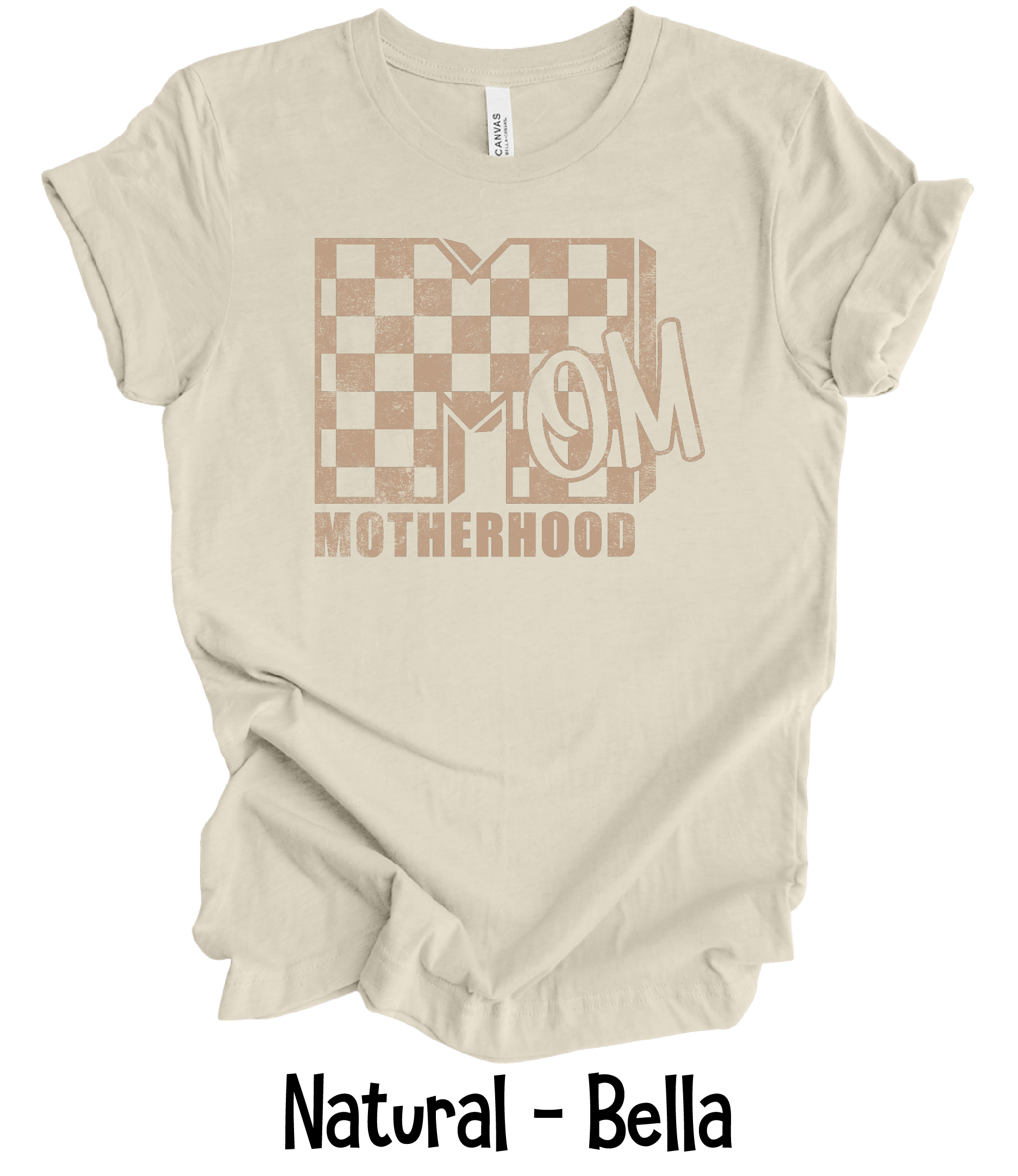 Mom Motherhood design is done on Bella Canvas shirts and offered in t-shirt, long sleeve and crewneck in most sizes.