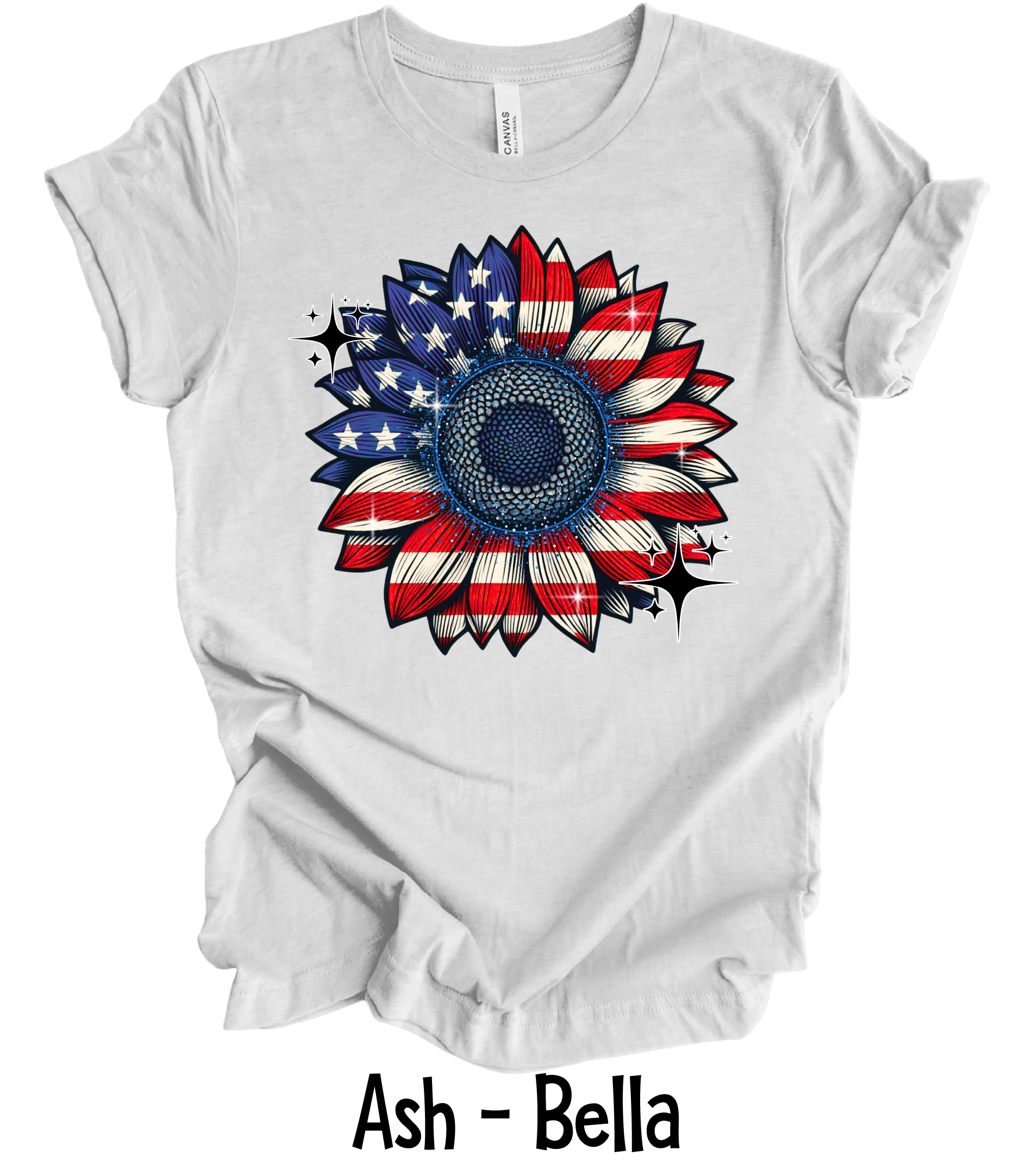 Patriotic Sunflower design is done on a Bella Canvas t-shirt with the option of ash, heather true royal or heather red for the shirt color.
